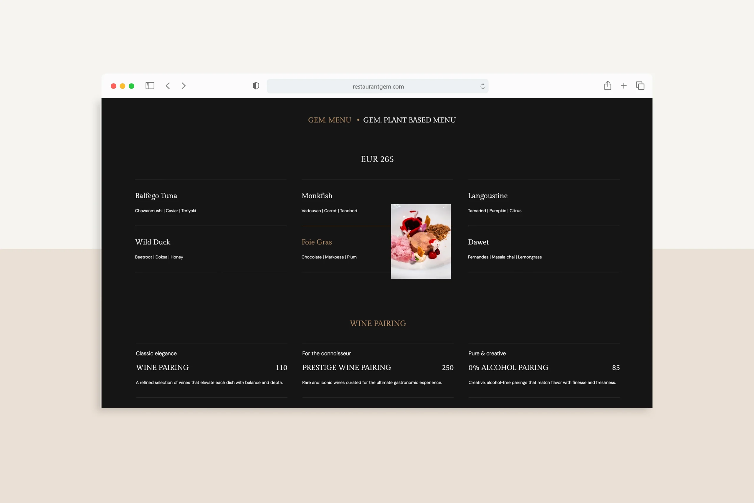 We creëerden een WordPress website dat fungeert als het eerste contactpunt van de totale reis die de gast gaat beleven. De website is ontworpen om niet alleen te informeren, maar om de bezoeker onder te dompelen in de wondere wereld van GEM. De serene vormgeving, intuïtieve navigatie en elegante presentatie van het menu en de suites bereiden de gast voor op de delicate en verfijnde ervaring die hen in het restaurant en daar buiten te wachten staat. Dit zorgt ervoor dat de online kennismaking voor de volle 100% aansluit bij de fysieke beleving.