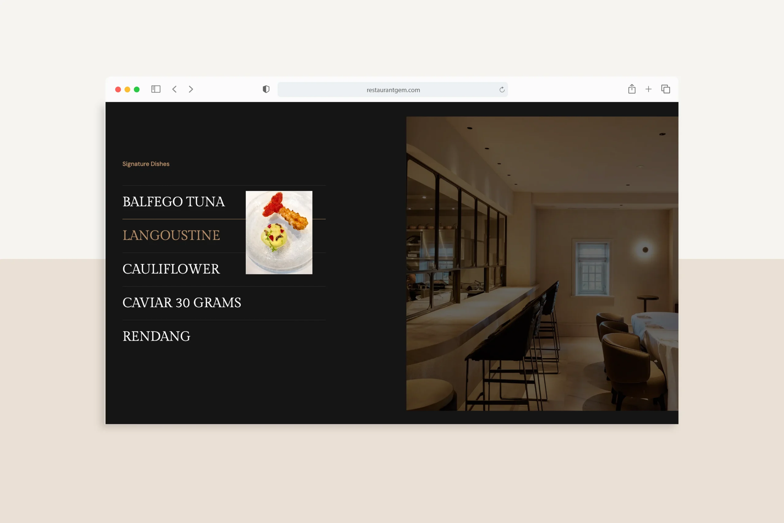De interactie zelf werd verfijnd met Lenis, een bibliotheek die een uitzonderlijk soepele en gracieuze scroll-ervaring levert. Deze technische symfonie van geavanceerde tools zorgt ervoor dat de website niet alleen functioneel is, maar ook luxueus en weloverwogen aanvoelt. Elke klik en scroll is een bewuste, vloeiende beweging, wat de digitale interactie verheft tot een niveau dat past bij de uiterst verfijnde service en aandacht voor detail van Restaurant GEM.